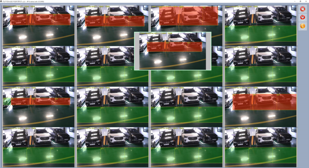 “영상기반 만공차판별 송출 어플리케이션 v2.0” 은 최대 210채널 (카메라), 채널당 최대 6 주차면을 동시에 감시하여 차량존재유무를 판별, 네트워크를 통해 서버로 전송하는 TCP/IP 기반 어플리케이션입니다.